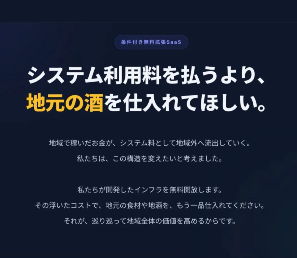 想像してみてください。システム利用料を払う代わりに、地元の美味しいお酒を一本多く仕入れる。その浮いたコストが地域に還り、お店も、生産者さんも、そしてお客さんも、みんながハッピーになる価値の循環が生まれるんです。とっても素敵なアイデアですよね!🍶💖