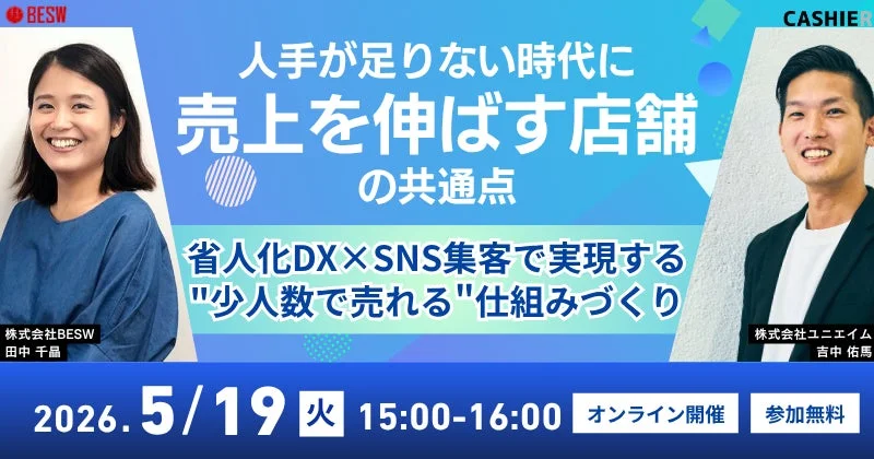 クラウドPOSレジサービス「CASHIER」を提供する株式会社ユニエイムと、SNSマーケティング・コンサルティングサービス「SNSCHOOL」を運営する株式会社BESWが、この課題に応えるべく、共同で無料オンラインウェビナーを開催します!🚀